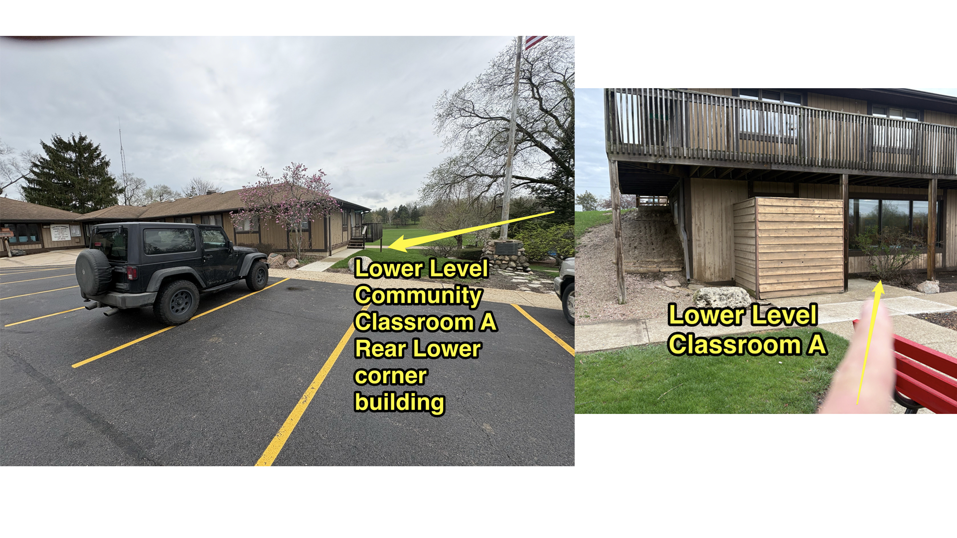 This is the building near Caboose Park. Follow the sidewalk that winds behind the flagpole to Lower Level Classroom A. See THIS photo for more detail.